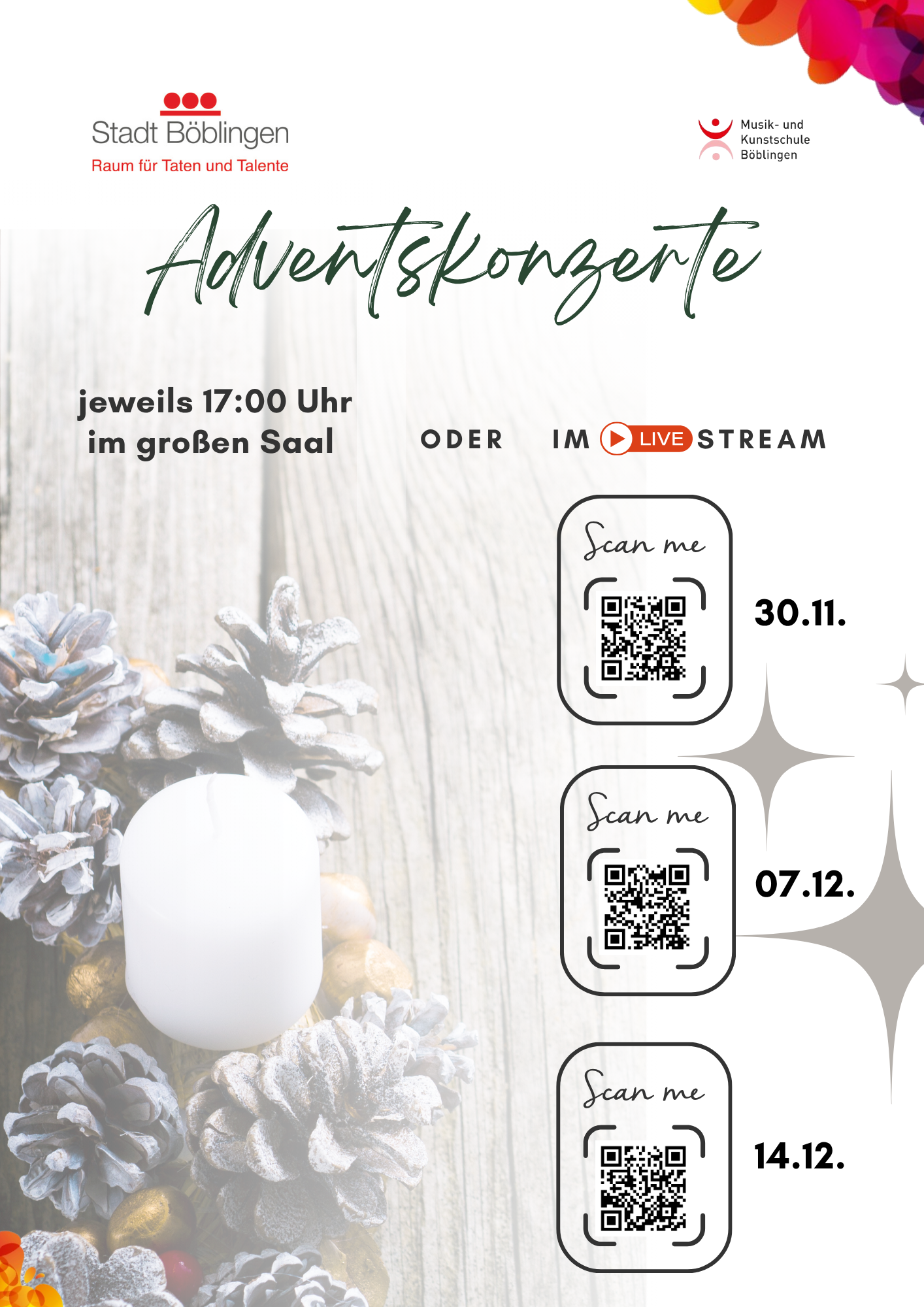 Unsere Adventskonzerte Live in der Musikschule oder im Livestream auf unserem YouTube Kanal. Ein tolles Weihnachtsprogramm mit unseren Schülerinnen und Schülern.