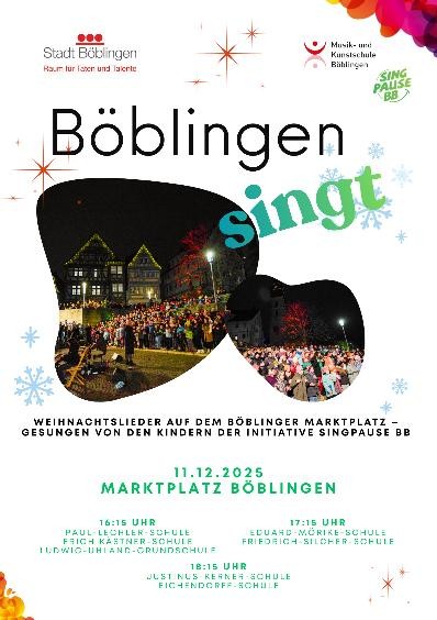 Wir laden Sie herzlich ein zu „Böblingen singt!“ am Donnerstag, den 11. Dezember 2025, auf dem Marktplatz. Ab 16:15 Uhr präsentieren die Schülerinnen und Schüler der Initiative Singpause Böblingen eine Reihe wunderschöner Weihnachtslieder und läuten gemeinsam die Weihnachtszeit ein.